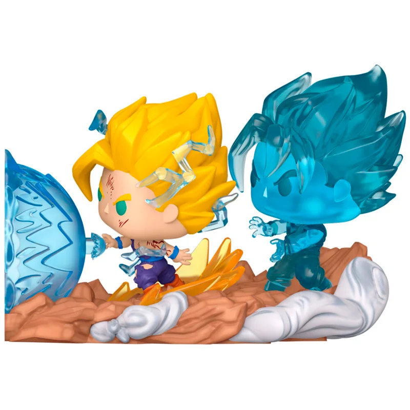 Lo que hace que la figura número 2223 sea excepcional es la representación visual del poder. Funko ha logrado plasmar a Gohan en su estado de Super Saiyajin 2, con el brazo herido y la expresión de esfuerzo máximo, mientras que la presencia de Goku detrás de él refuerza la narrativa del «Kamehameha Padre e Hijo». Los efectos de energía translúcida que emanan de la base y las chispas del aura eléctrica están cuidados al detalle para transmitir la magnitud del ataque. Cada rasgo, desde el cabello erizado hasta el desgaste de la ropa, está diseñado para inmortalizar este instante legendario.